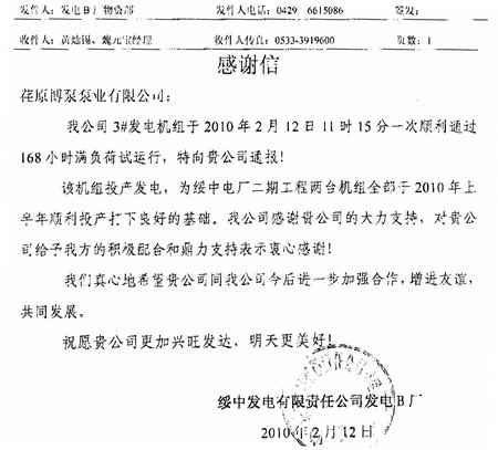 附:綏中發(fā)電B廠發(fā)來的感謝信