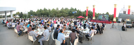 下午5點(diǎn),在夕陽的映照中,公司辦公樓前,忙碌的員工穿梭在會(huì)場(chǎng),辦公樓南面已搭建好舞臺(tái),碩大的LED屏矗立在舞臺(tái)上。舞臺(tái)兩側(cè)各豎立著兩個(gè)團(tuán)結(jié)柱。舞臺(tái)前的空地上,已擺放好63張桌子,每張桌子配放6把椅子。桌子上,豐盛的飯菜已放好,靠西邊的草坪旁,是備好的新鮮的青島扎啤。