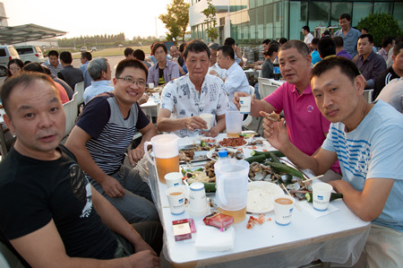 17:30,志賀進(jìn)總經(jīng)理端著酒杯,走到舞臺(tái)前,首先感謝廣大員工的辛勤努力,使公司取得很好的業(yè)績(jī),隨著一聲“干杯”,荏原博泵第五屆納涼晚會(huì)拉開了序幕。公司380多名員工,分部門有序而坐,大家推杯換盞,興高采烈。公司領(lǐng)導(dǎo)挨桌給員工們敬酒,大家沒有了上下級(jí)的拘謹(jǐn),一派歡樂祥和的景象。
